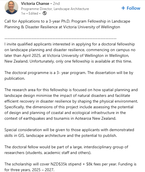 Professor Victoria Chanse invite qualified applicants interested in applying for a doctoral fellowship on landscape planning and disaster resilience, commencing on campus no later than April 2025, at Victoria University of Wellington in Wellington, New Zealand. Unfortunately, only one fellowship is available at this time.